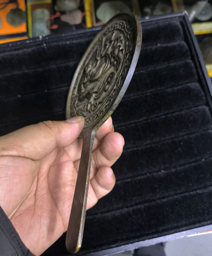 属性:年代不详,红铜 ,带柄形,人物故事纹饰,大(大于15cm)。