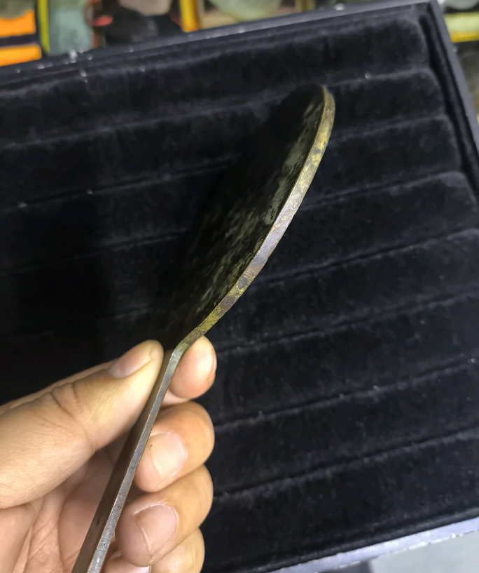 属性:年代不详,红铜 ,带柄形,人物故事纹饰,大(大于15cm)。